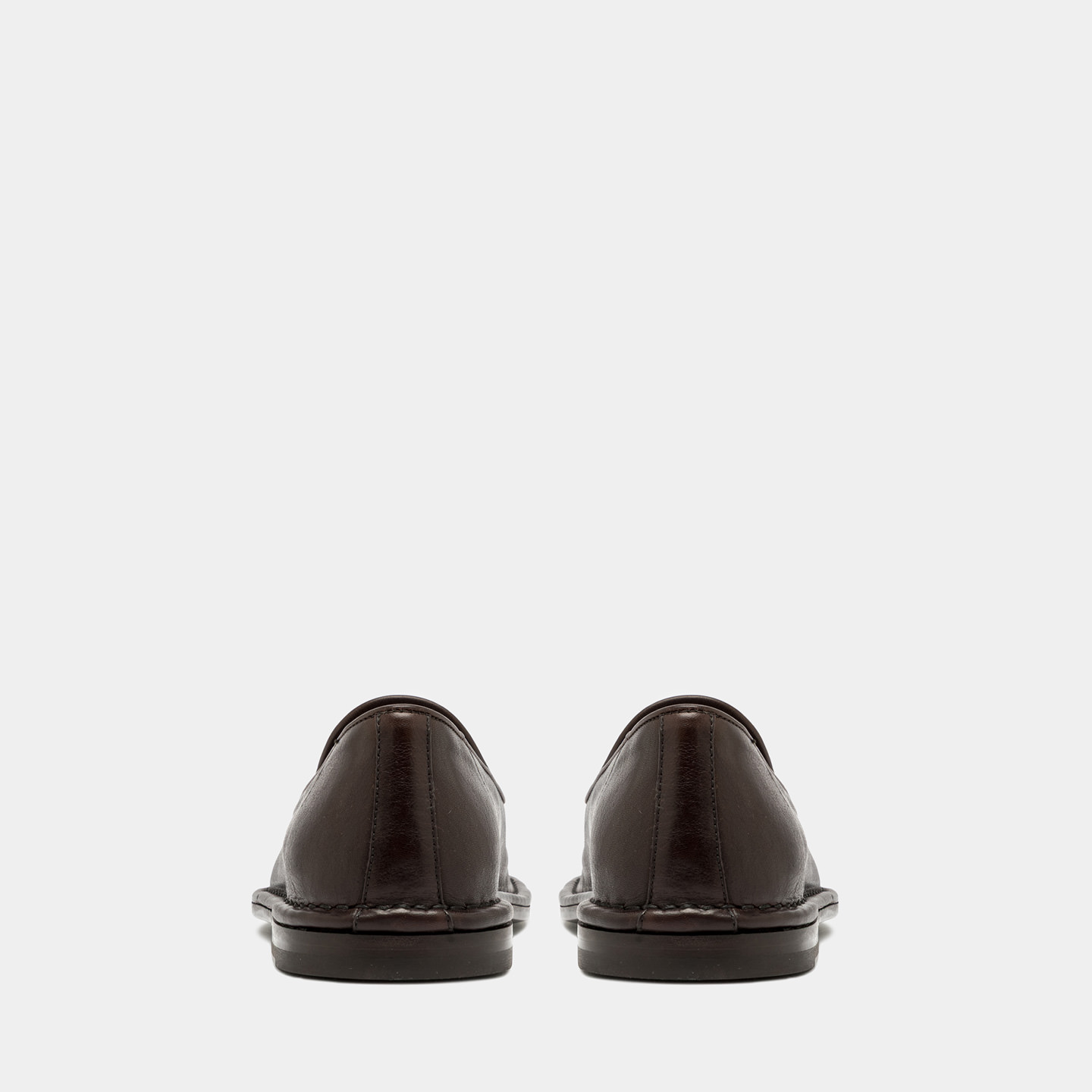 Ercole is a men’s leather slipper, Made in Italy, crafted from soft vegetable-tanned calfskin in a dark chocolate brown shade.