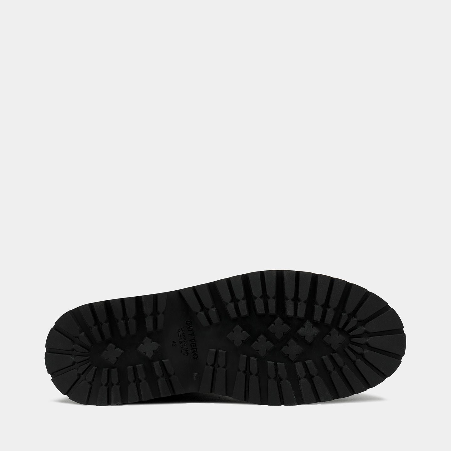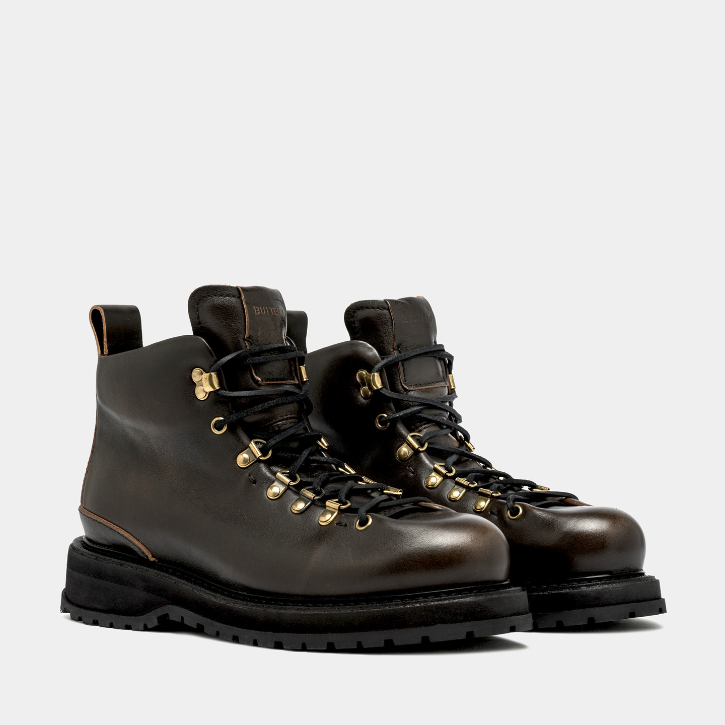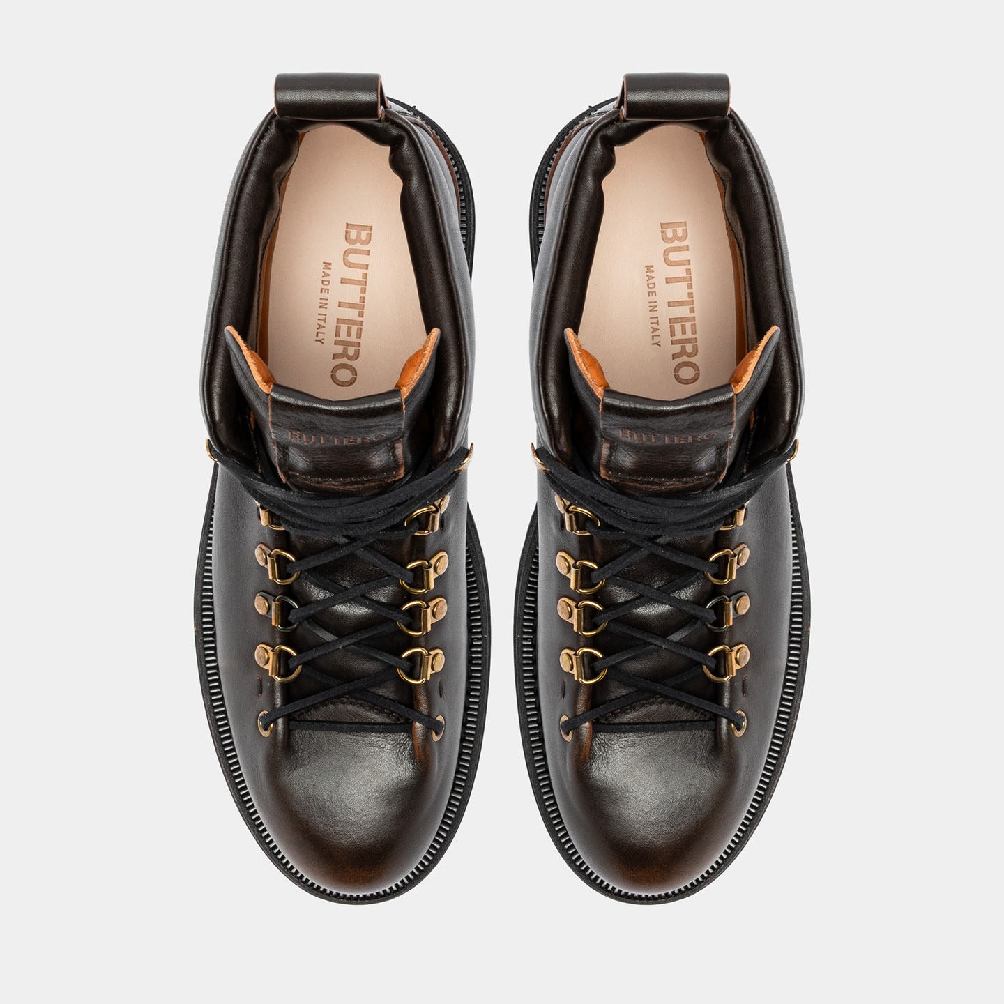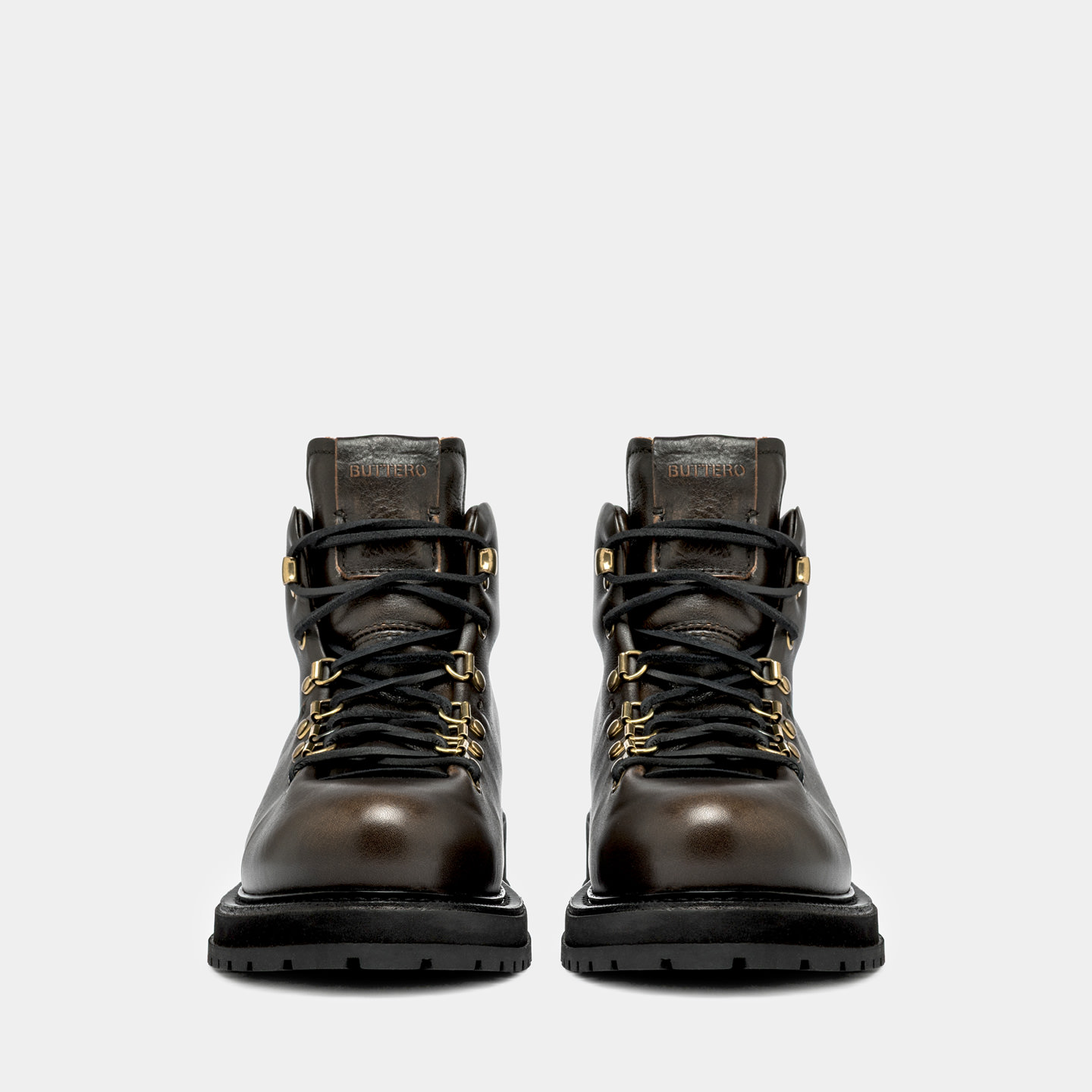 Leather label seamed at tongue with Buttero logo detailing in relief. Squared leather laces. Metal bell hooks. Padded collar. Leather lining. Removable sockliner in natural leather. Welt detailing in natural leather; micro sole with rock-like commando tread in rubber.