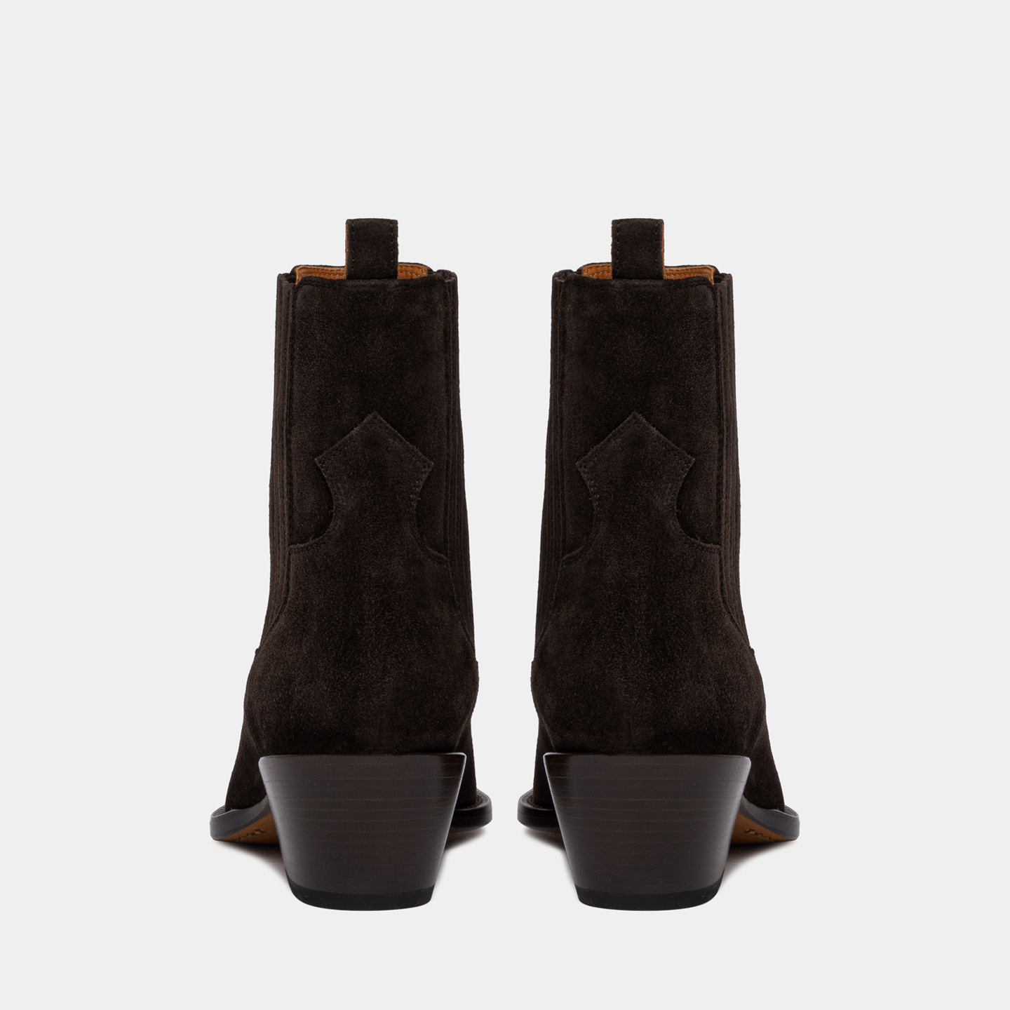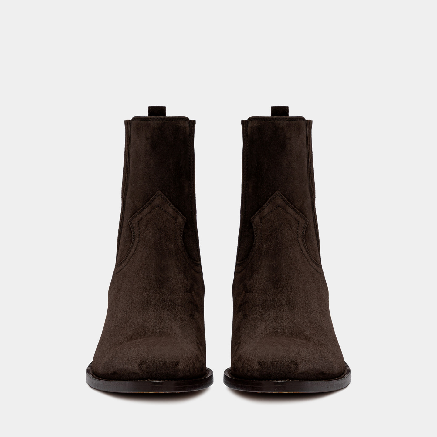 Made in Italy Western-inspired Annie Ankle Boots in moka brown suede with elastic.