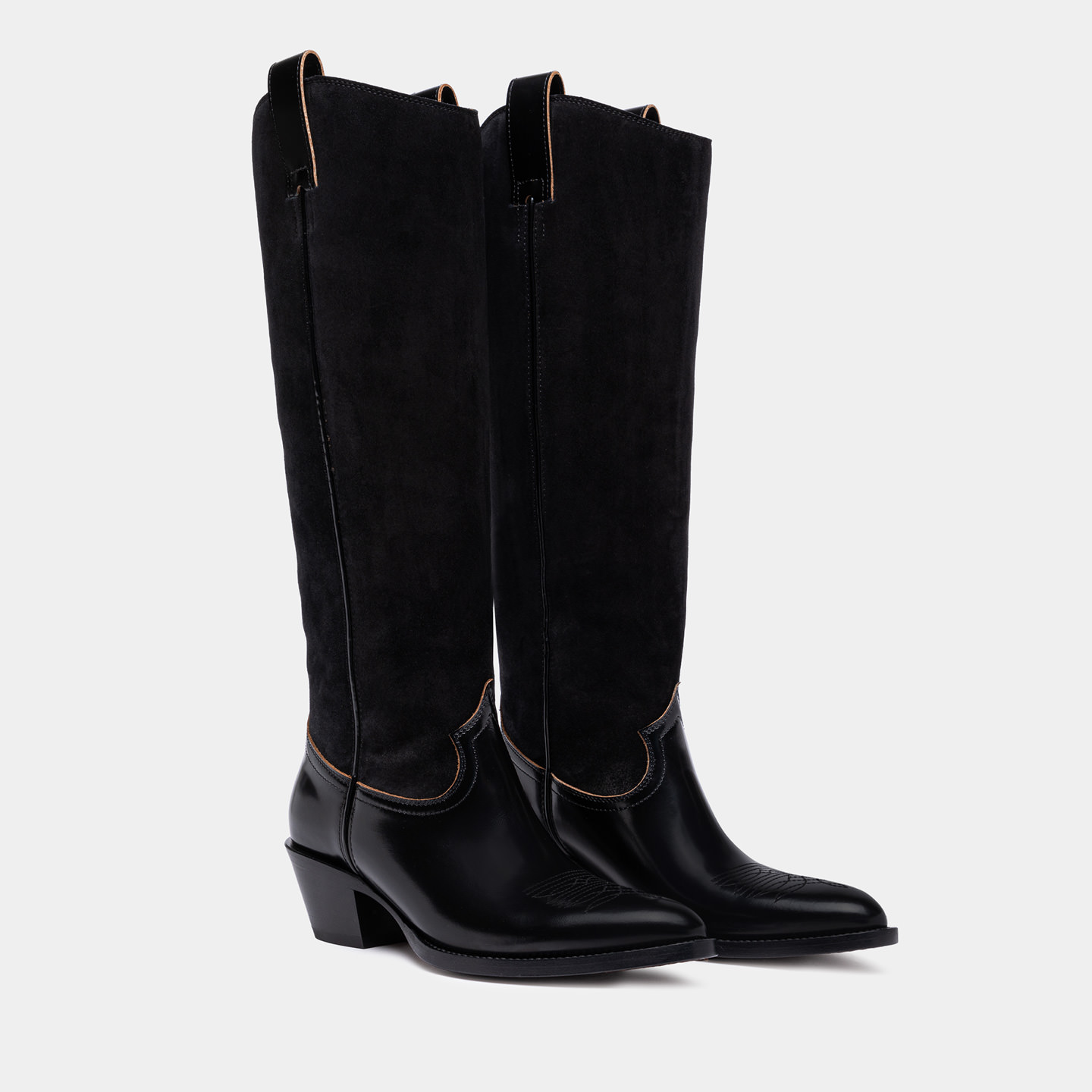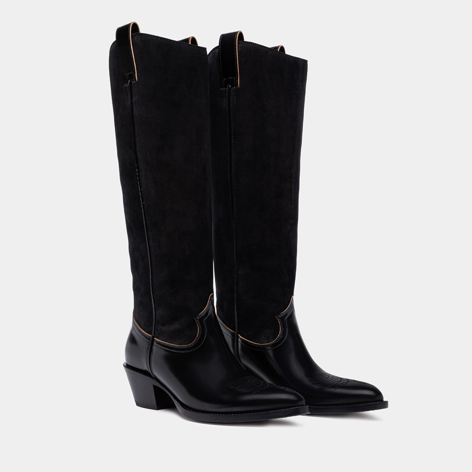Made in Italy Western-inspired Annie boots with brushed calf leather toe color black and leg in black suede.