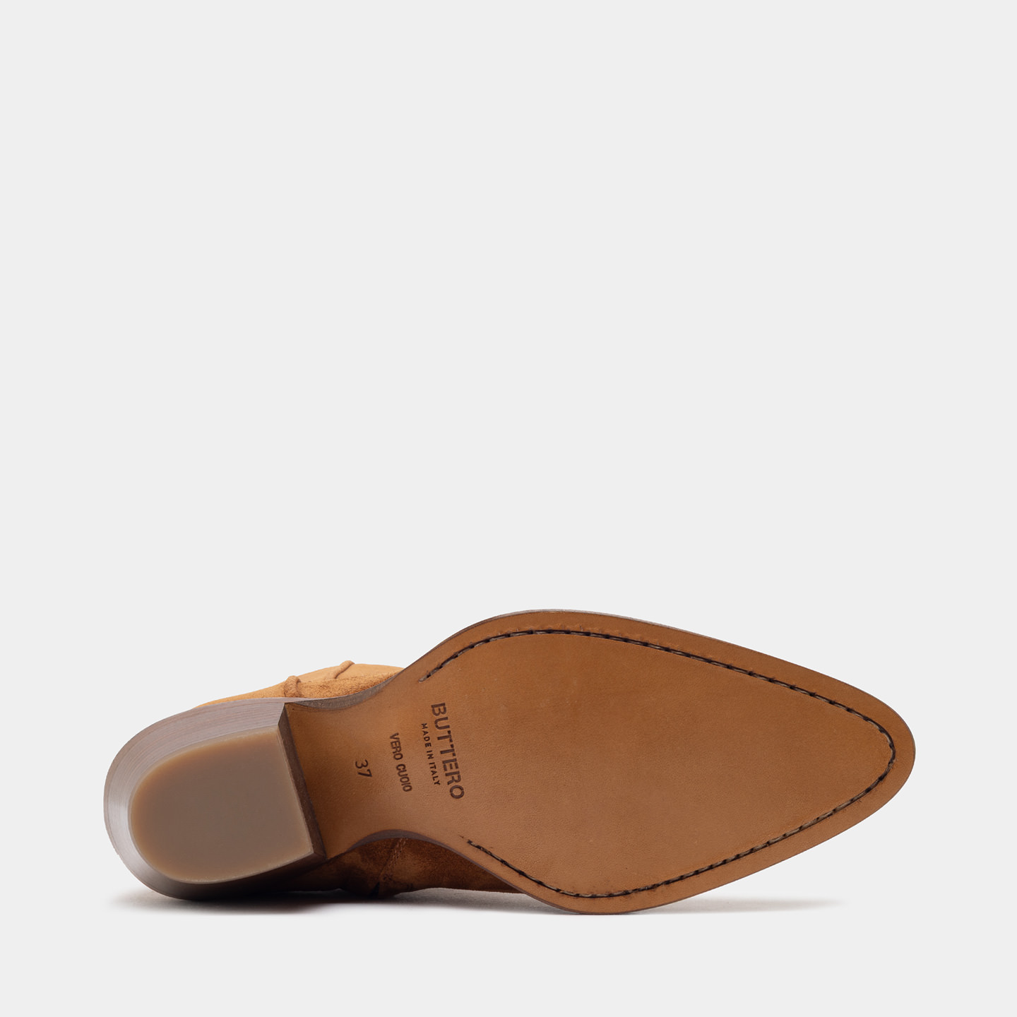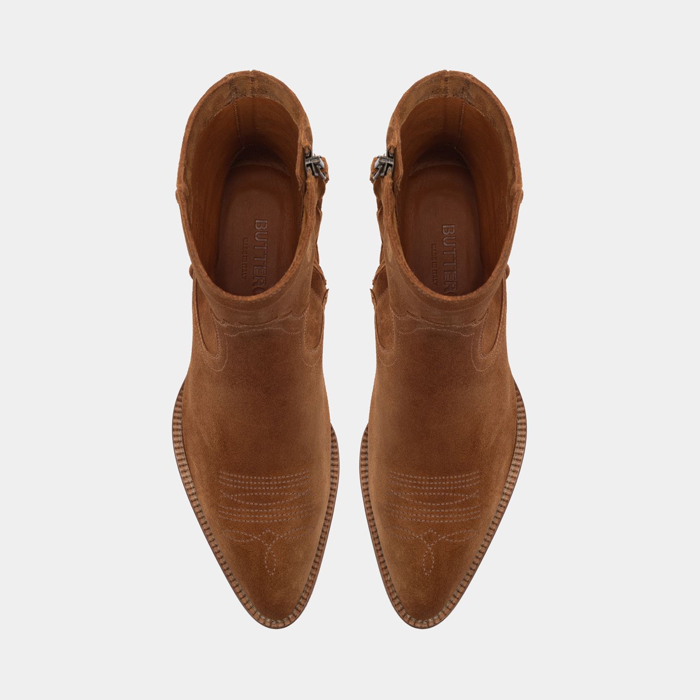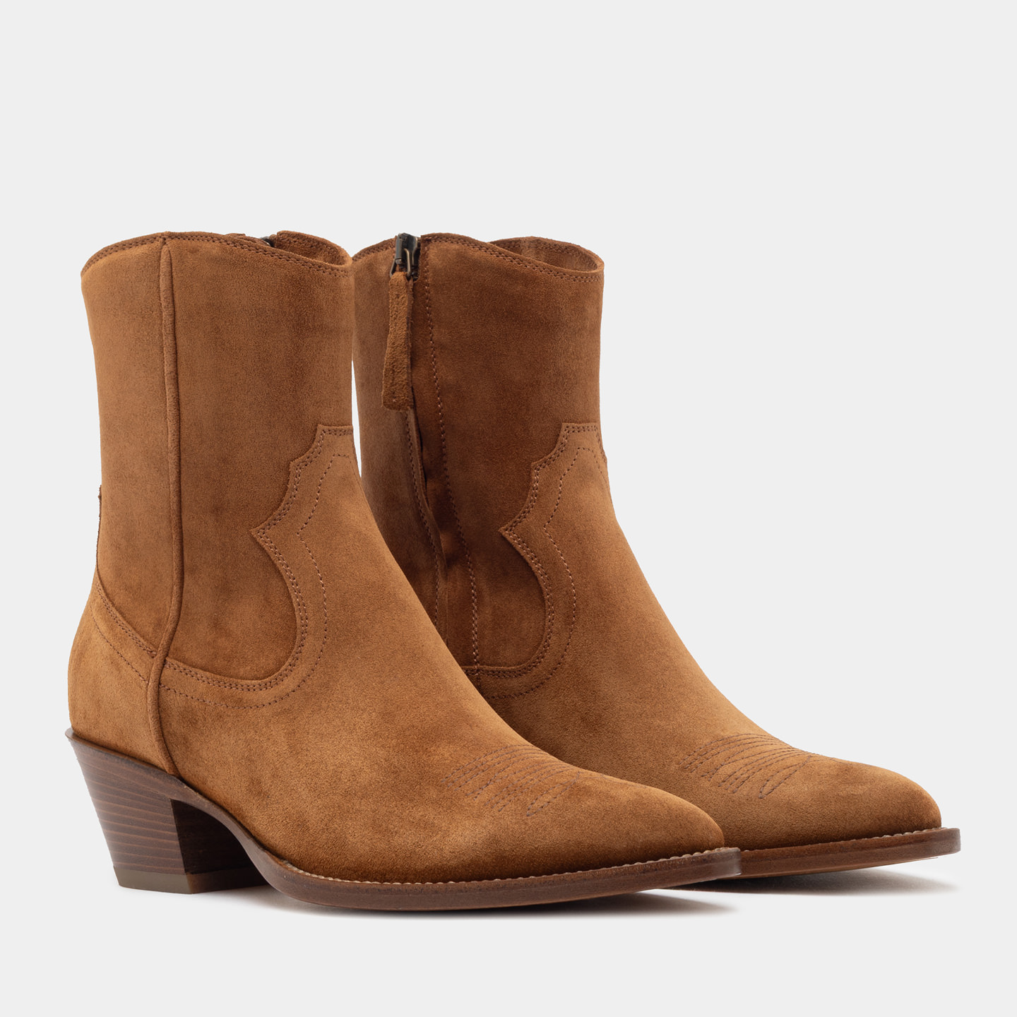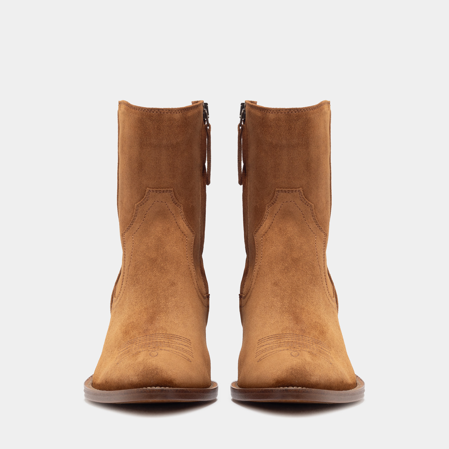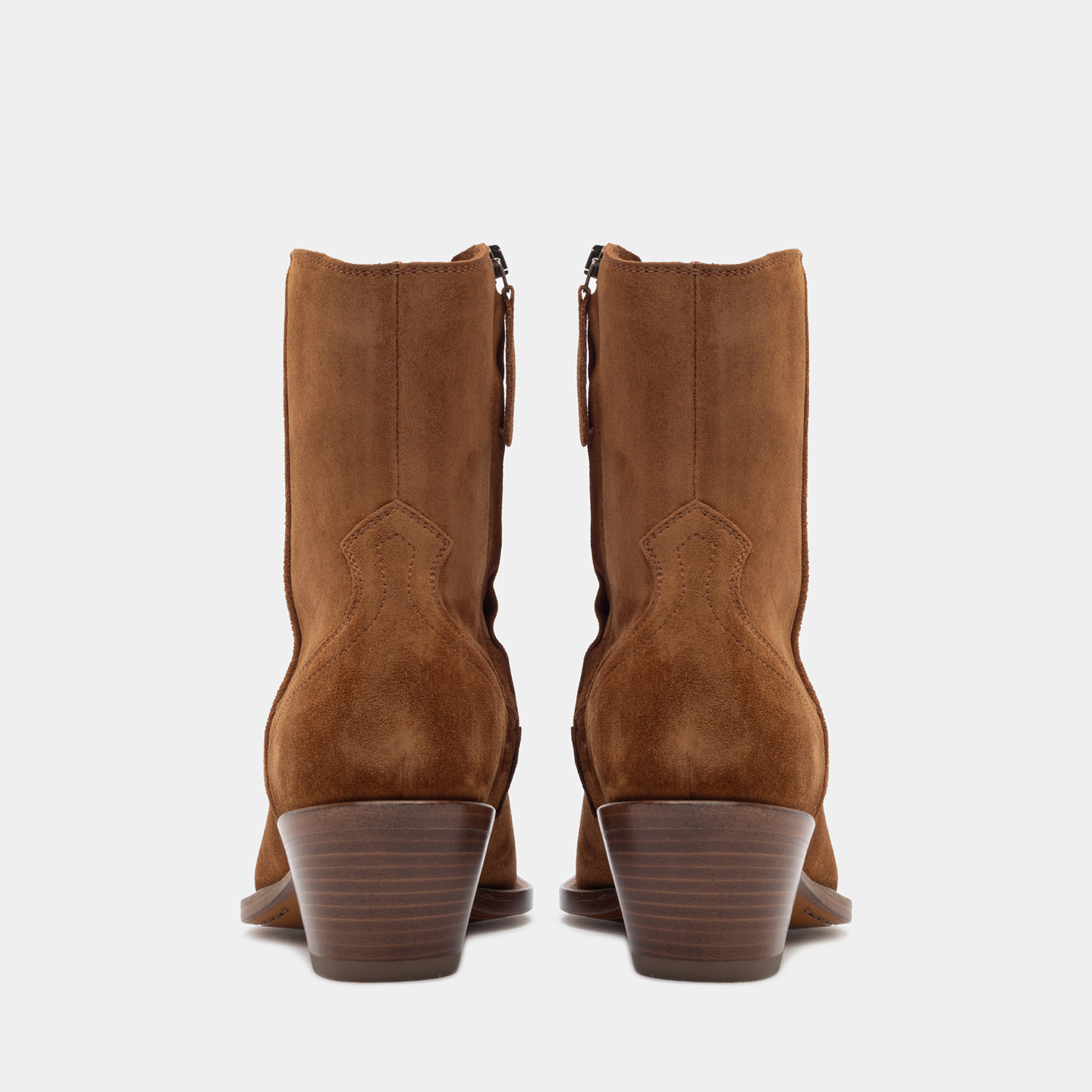 Réalisée en cuir de veau suédé couleur cuivre, elle présente une tige souple caractérisée par des coutures western originales, qui ajoutent un détail distinctif tout en conservant une esthétique équilibrée. La fermeture éclair latérale permet un chaussage pratique et immédiat, tout en préservant un profil soigné. La semelle en cuir véritable est réalisée selon la construction Blake et complétée par un talon légèrement incliné avec un insert en caoutchouc, conçu pour garantir un confort durable et une bonne résistance à l'usure dans le temps.