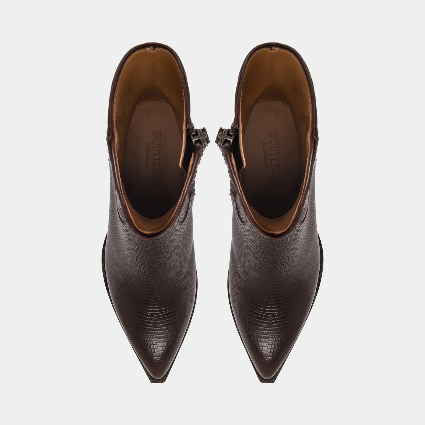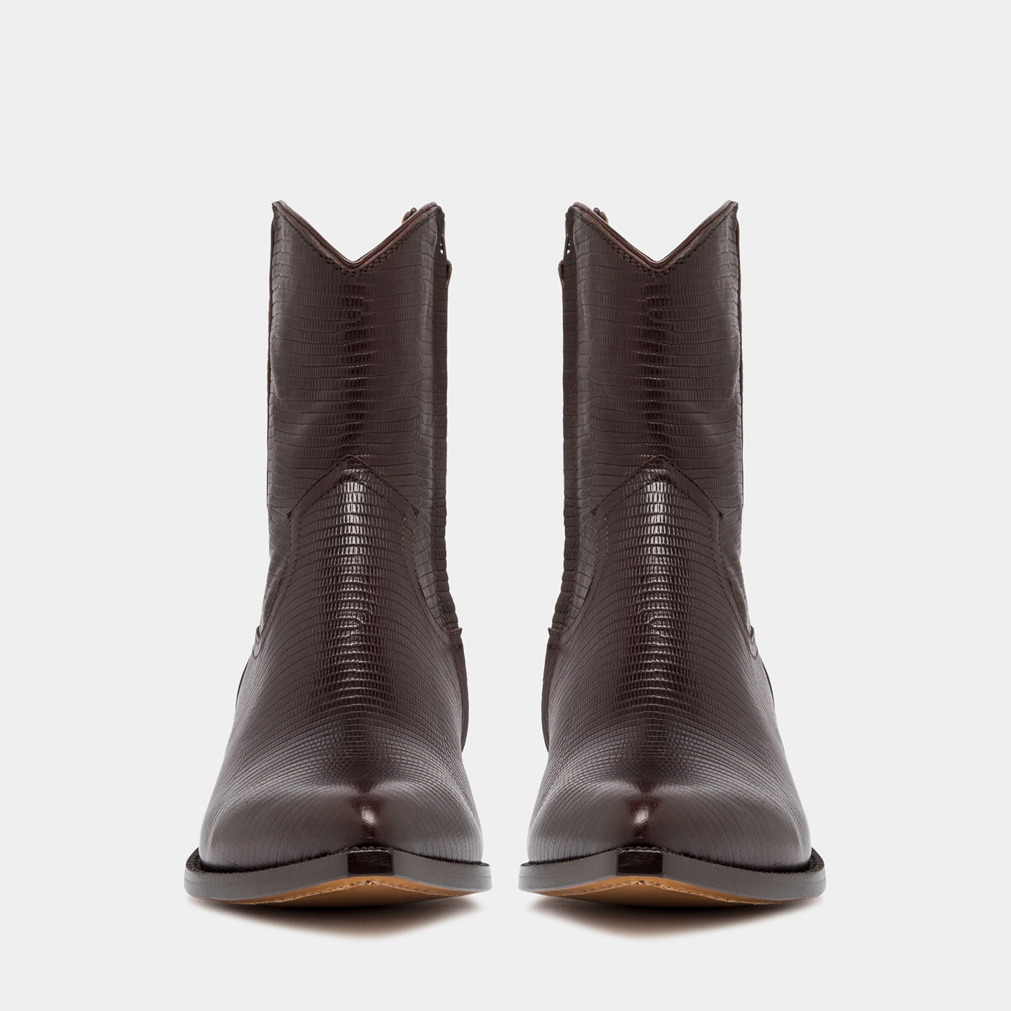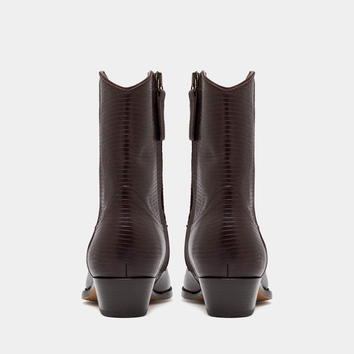 Réalisé en cuir avec un imprimé lézard, un procédé qui crée une micro-texture régulière inspirée des peaux exotiques, ajoutant du caractère et une note matérielle au modèle.