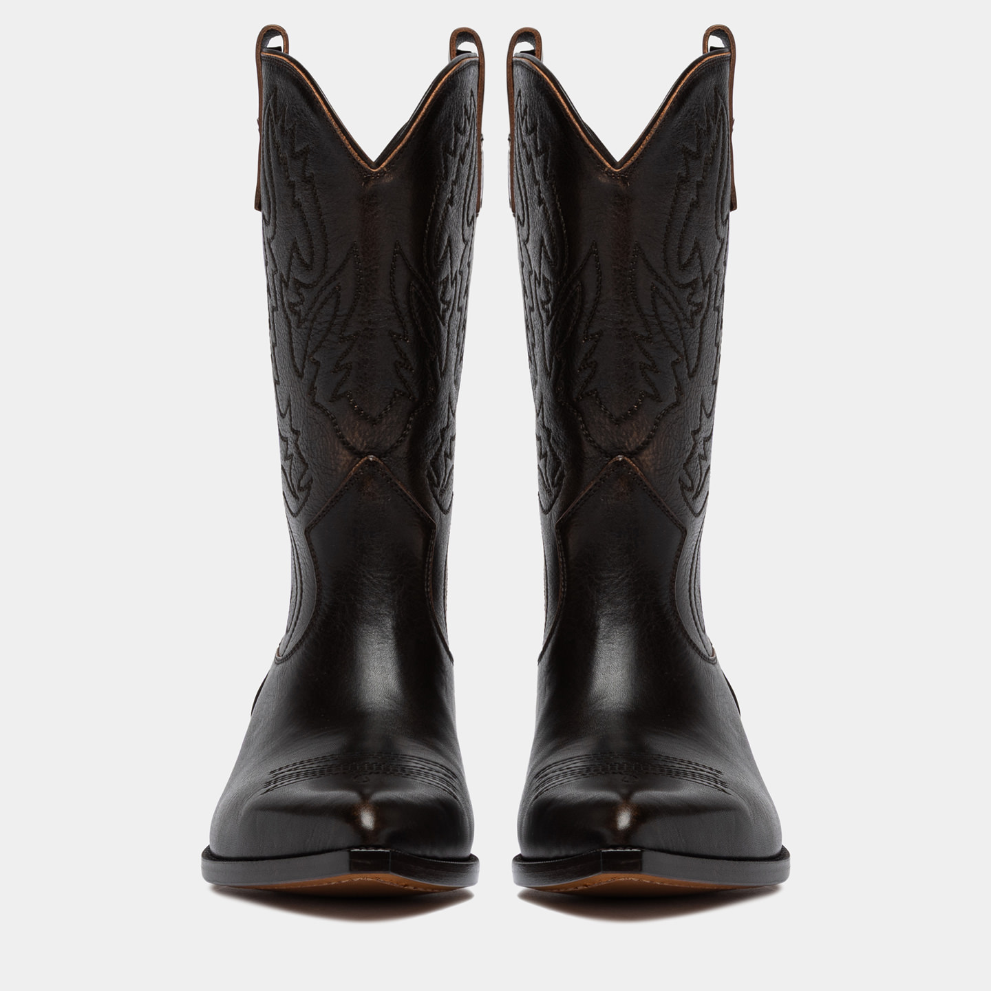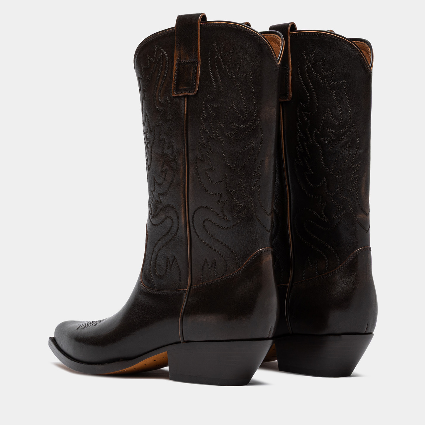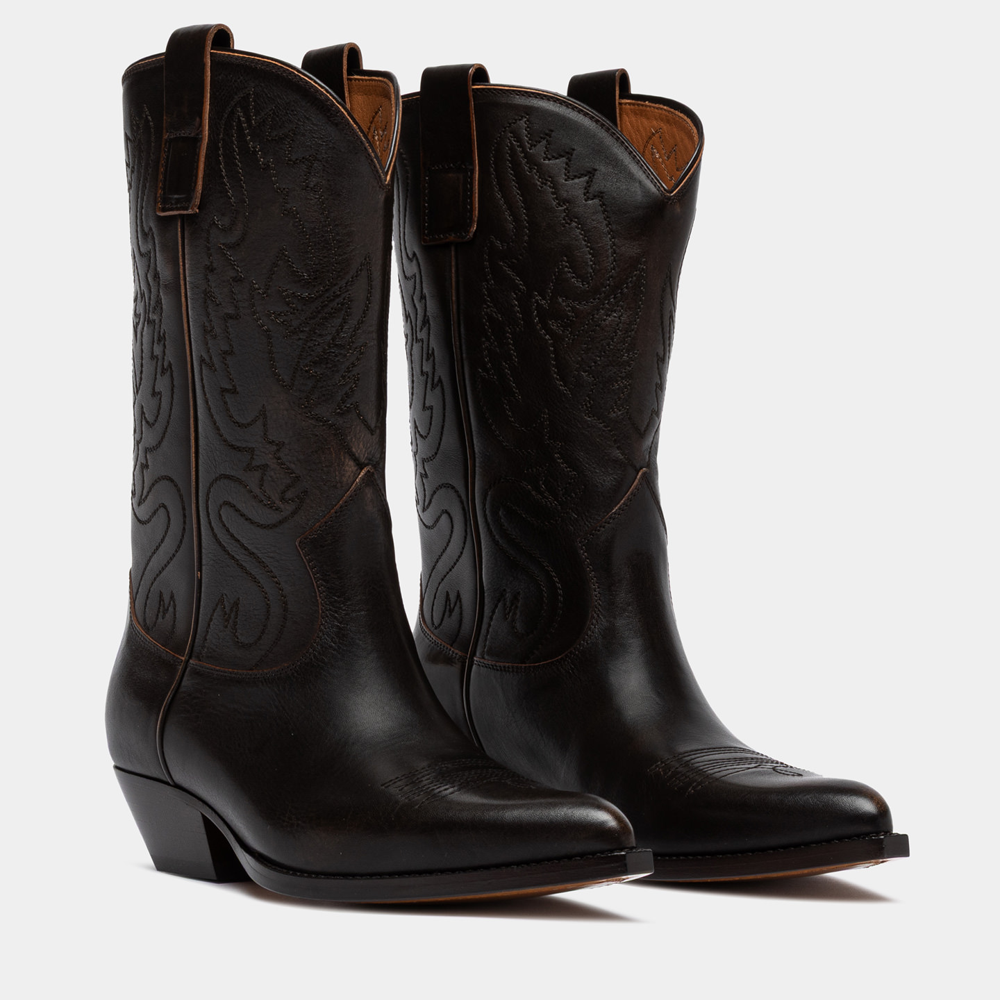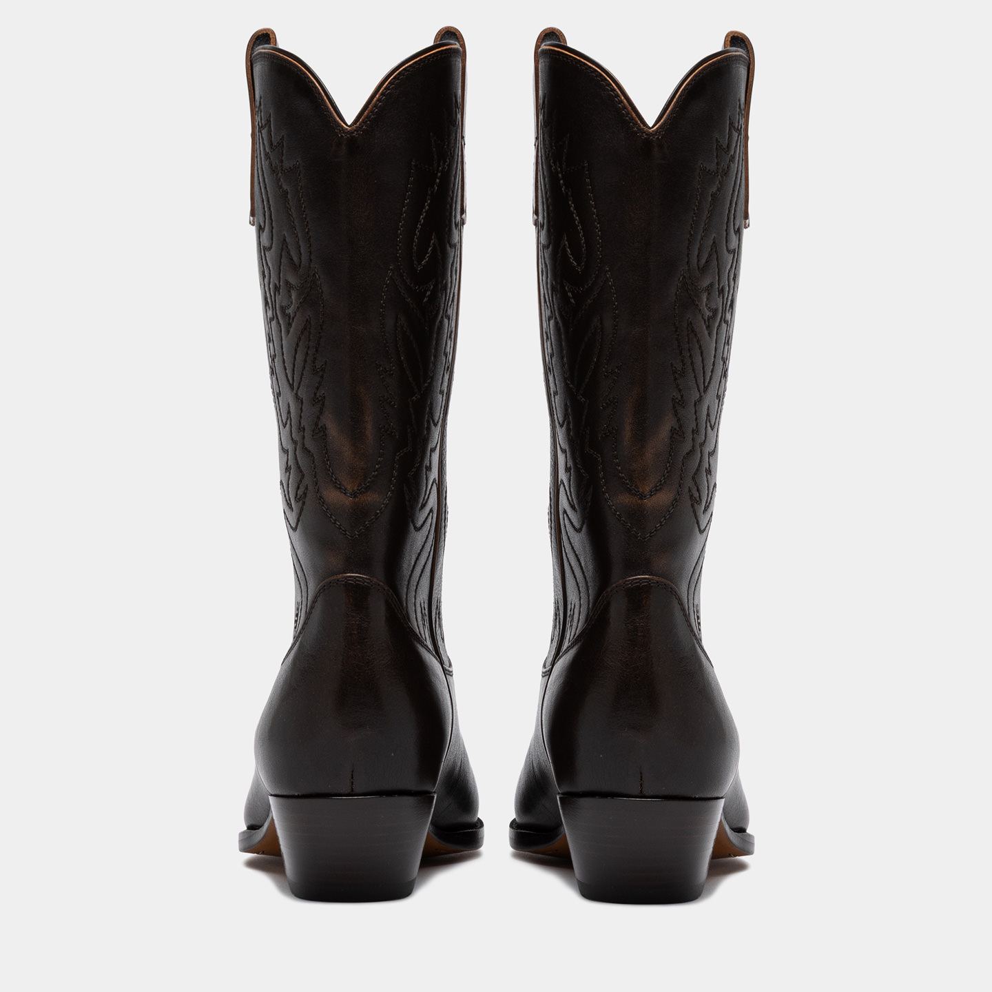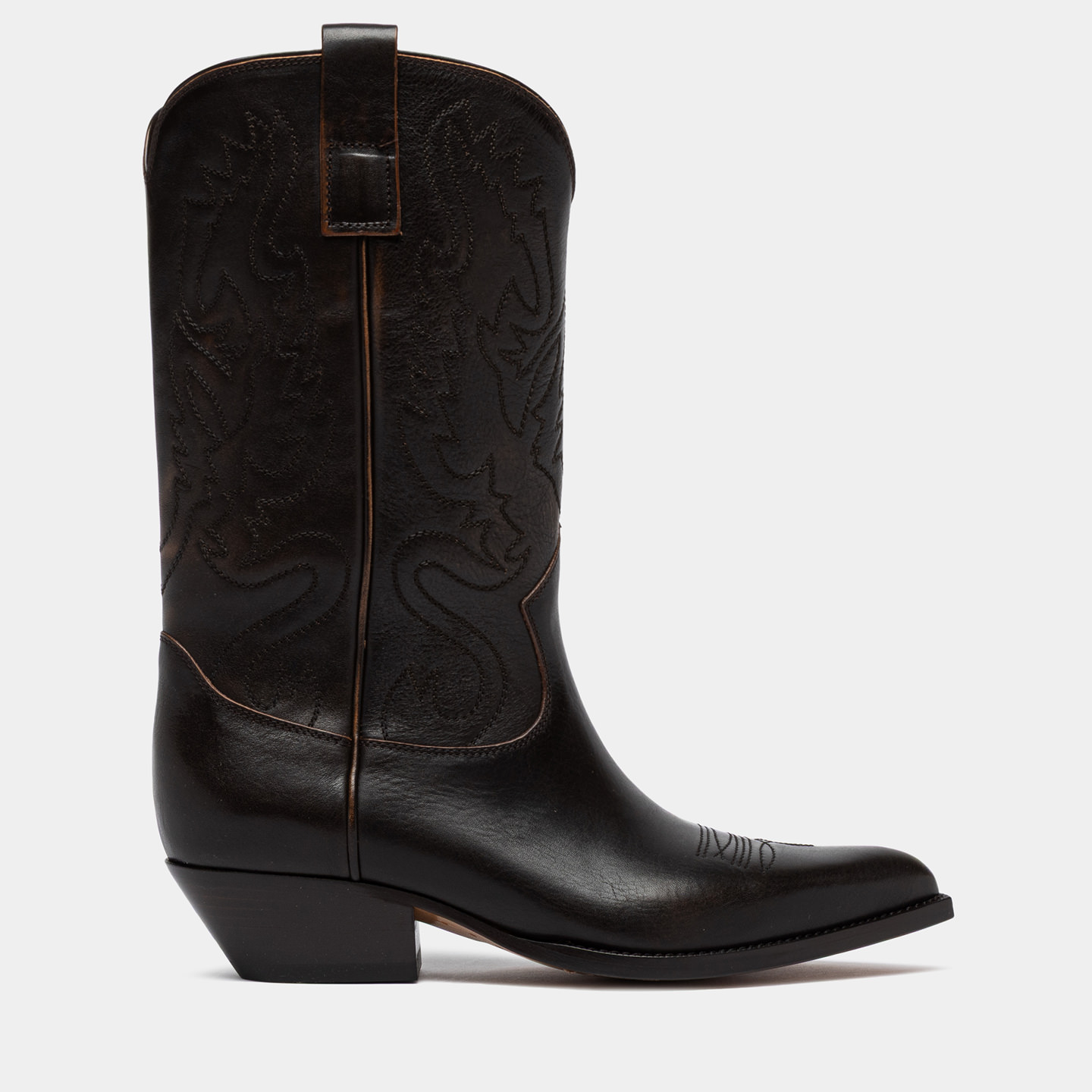 Realizzato in pelle di vitello con finitura aged, spazzolata a mano per creare leggere sfumature vissute che si intensificano con l’uso. Ricamo tono su tono su punta e gambale. I loop laterali facilitano la calzata, mentre il profilo superiore rifinito in pelle valorizza la linea dello stivale e ne esalta i dettagli.