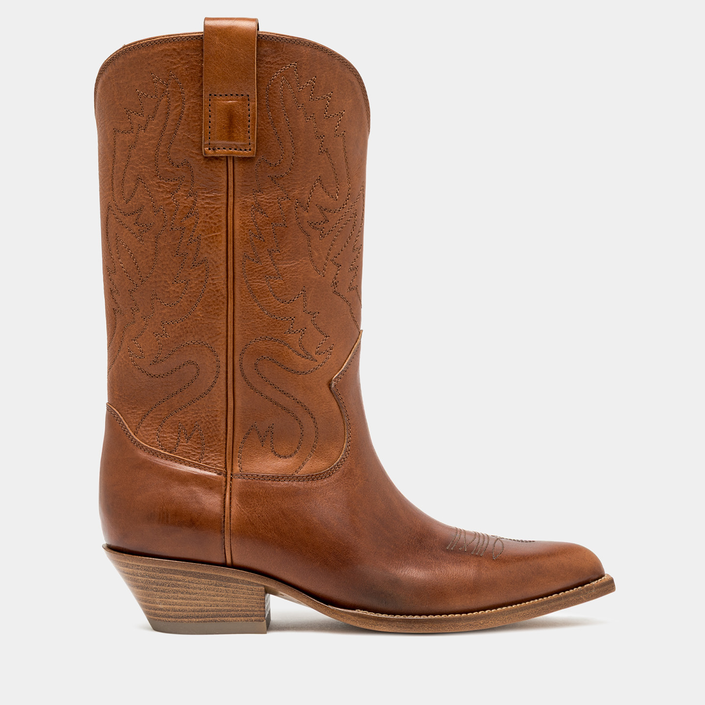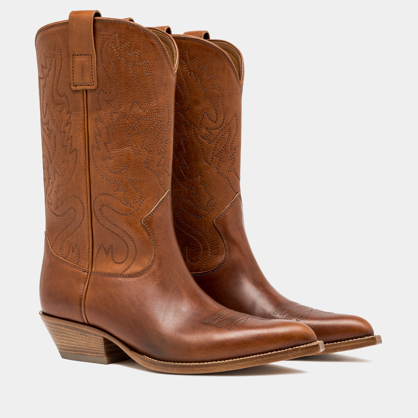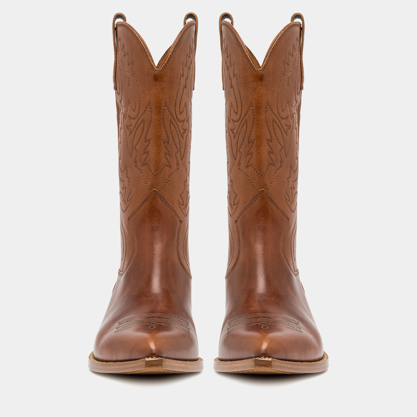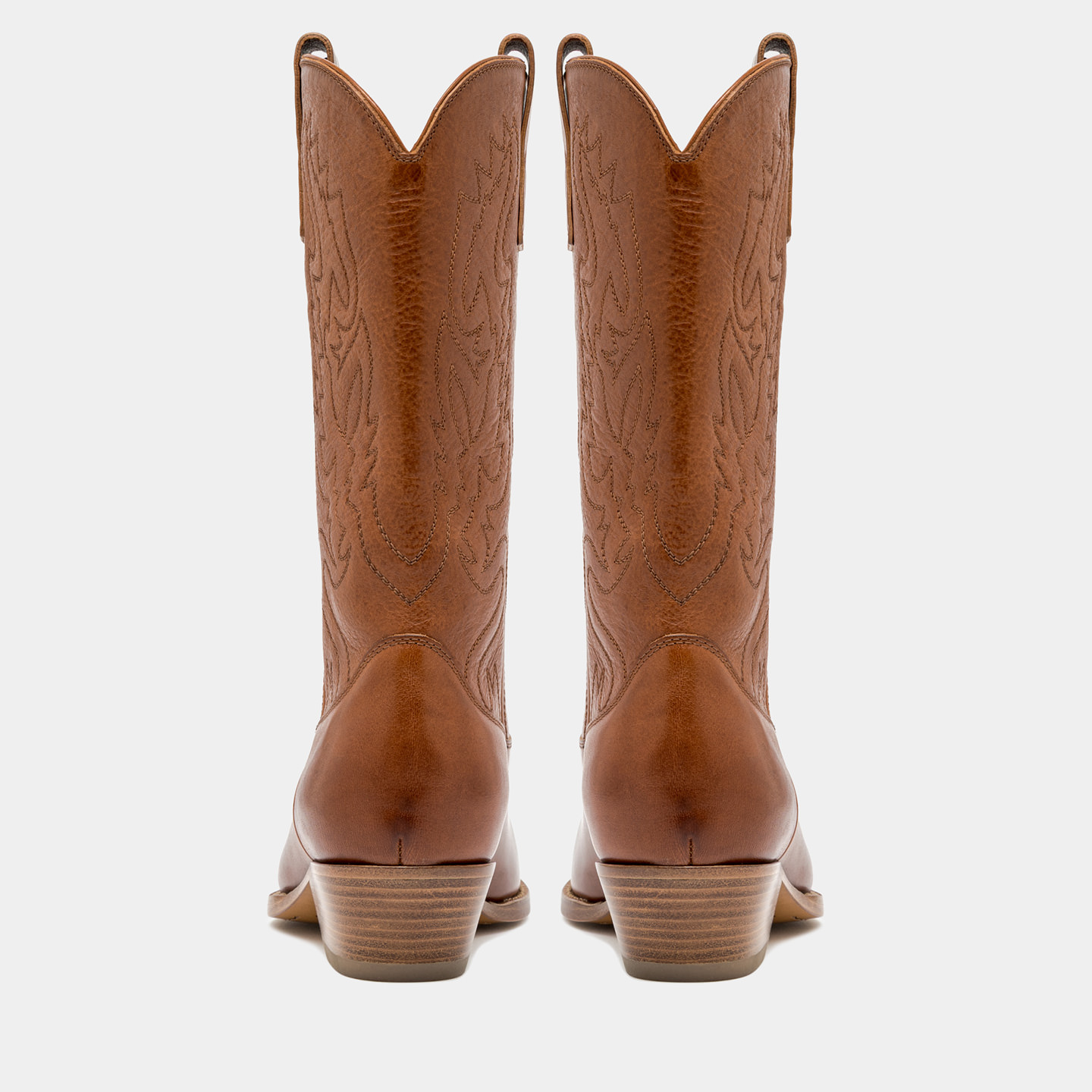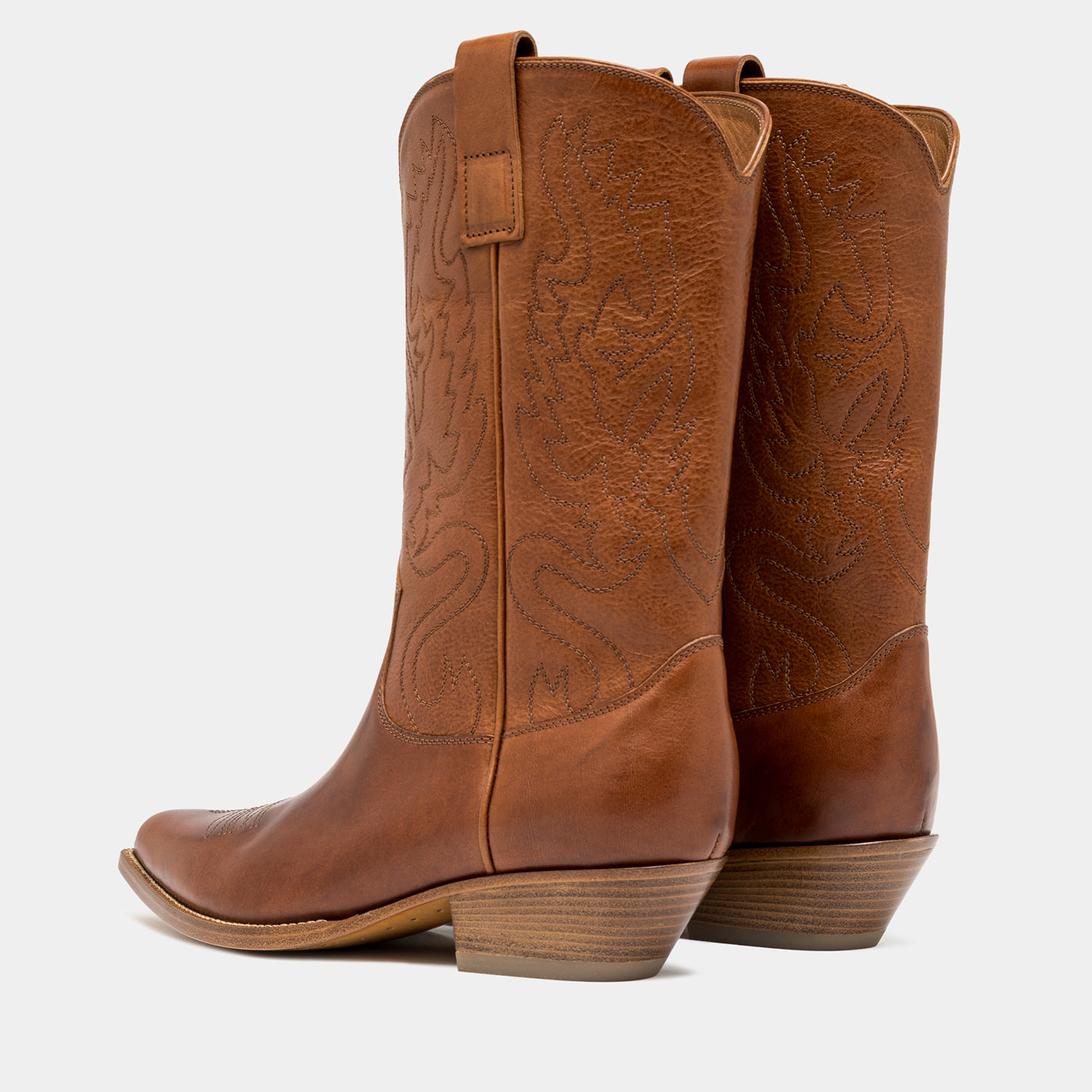 Realizzato in pelle di vitello colore cuoio scuro, con ricamo tono su tono sulla punta e sul gambale. I loop laterali facilitano la calzata, mentre il profilo superiore rifinito in pelle valorizza la linea dello stivale e ne esalta i dettagli.