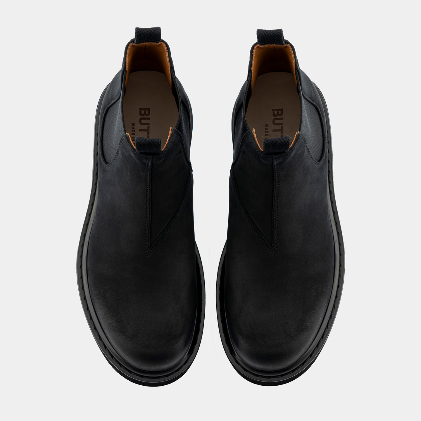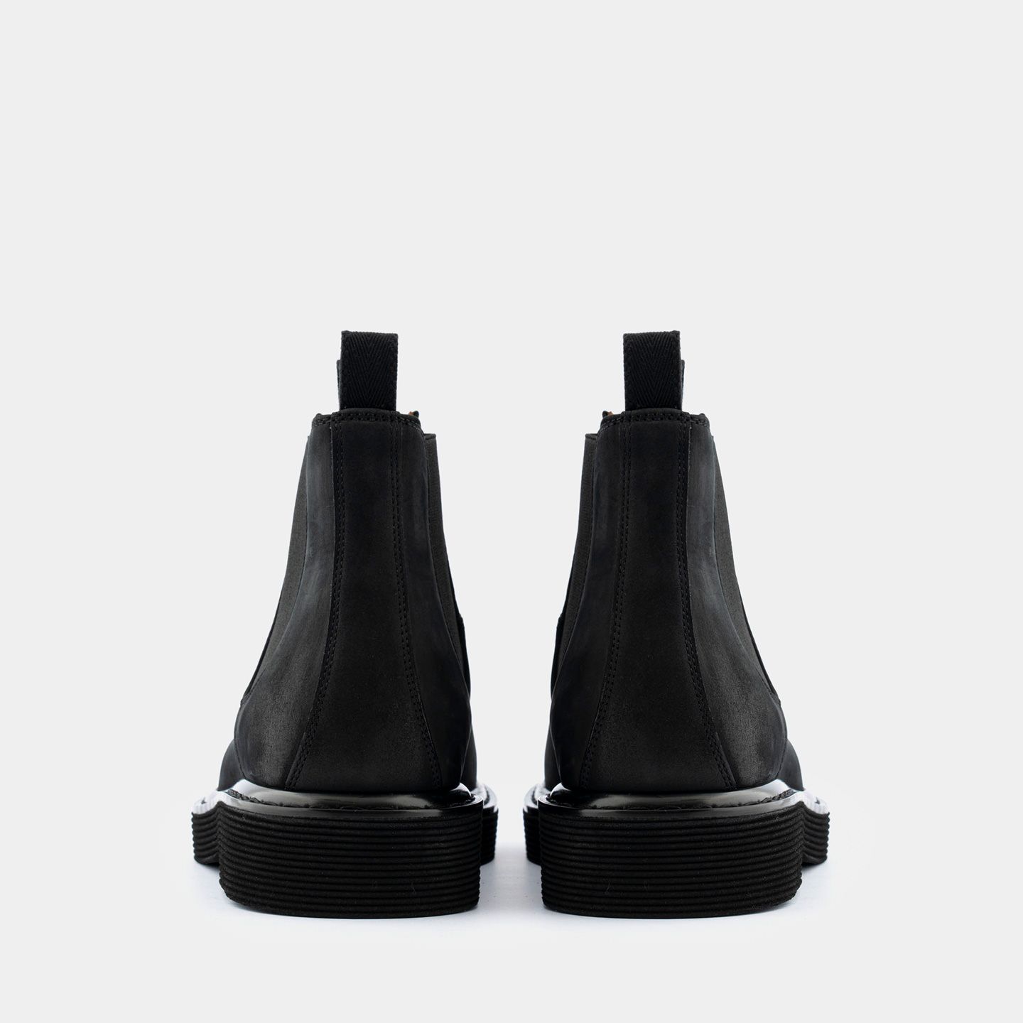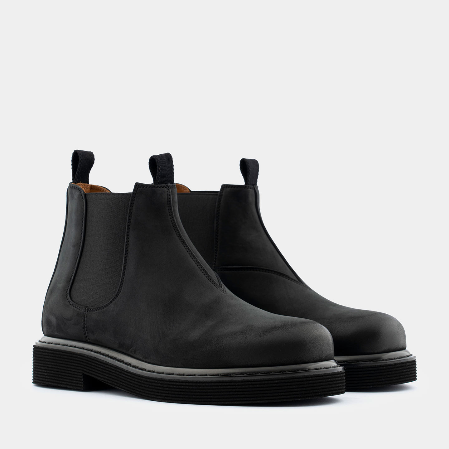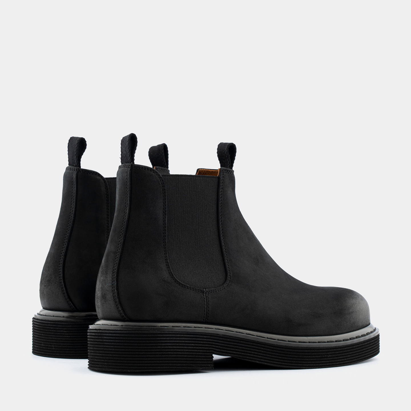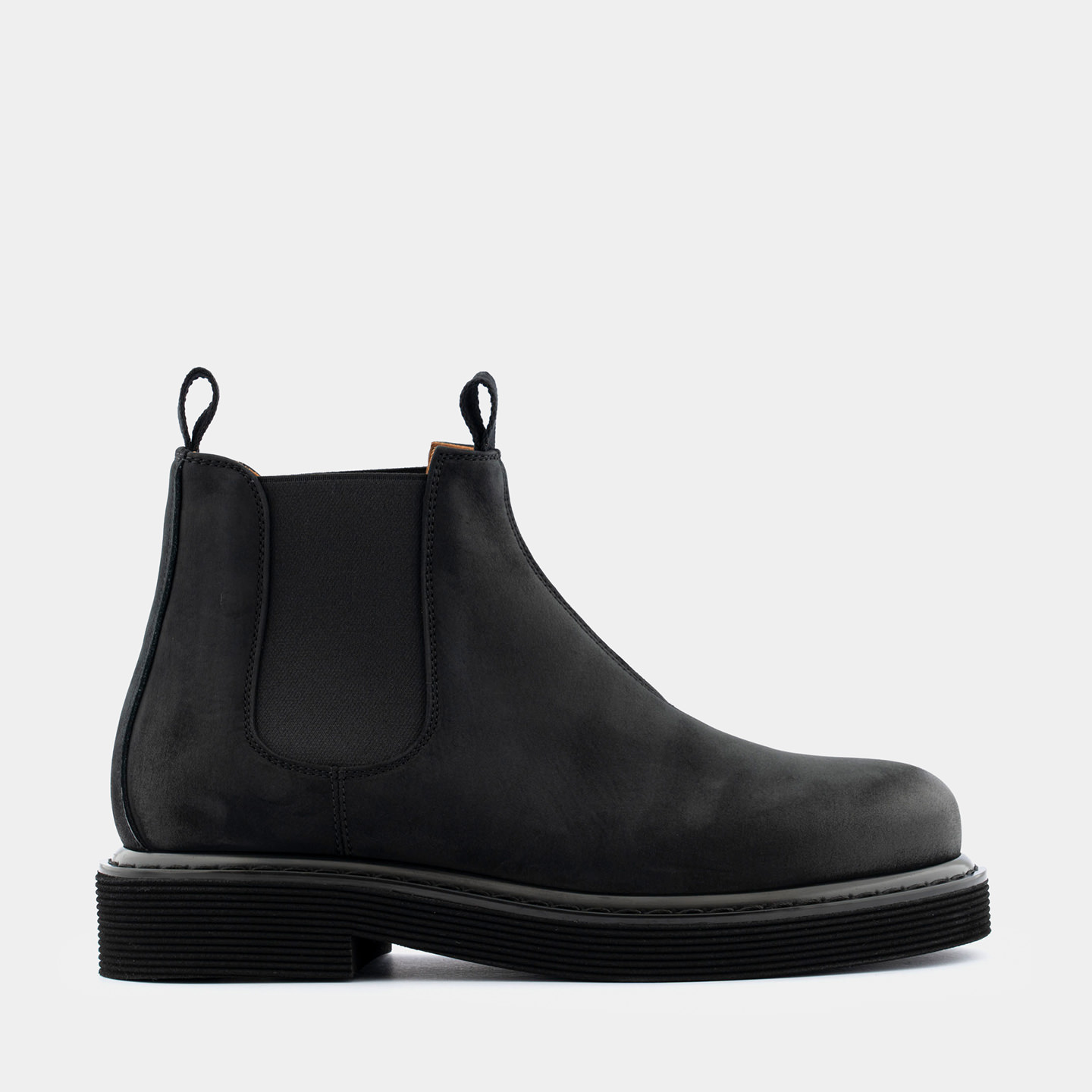 Stivaletti Made in Italy modello Leggenda in nabuk nero. Una reinterpretazione contemporanea del classico Chelsea, con una silhouette moderna e voluminosa.